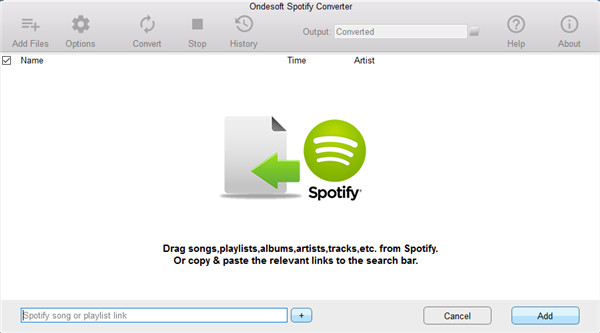 将您要从Spotify应用程序直接转换为界面的歌曲,播放列表或专辑拖放。或单击“添加文件”按钮,将歌曲,专辑或播放列表的链接复制并粘贴到左下方,然后单击“添加”