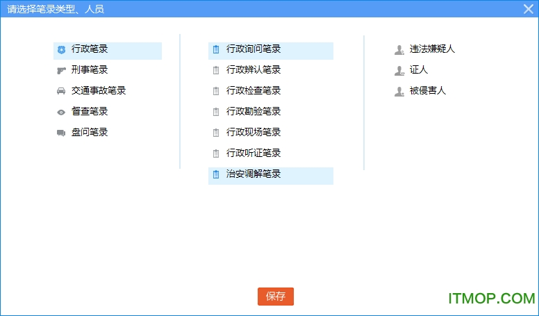 2、选择案件的类型:支持行政笔录、刑事笔录、交通事故笔录、督查笔录、行政询问、行政 辨认