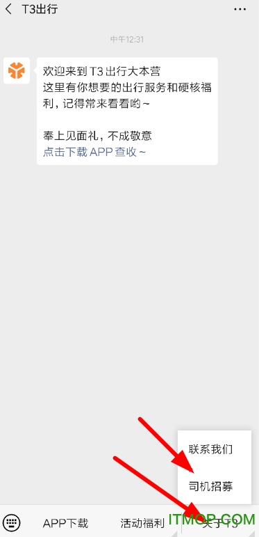 1、现在大家如果想注册成为司机的话,那么就需要在微信里面搜索“t3出行”,然后关注公众号点击右下角的“关于T3”按钮。