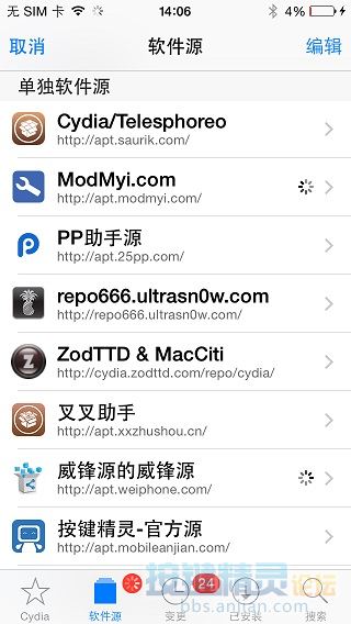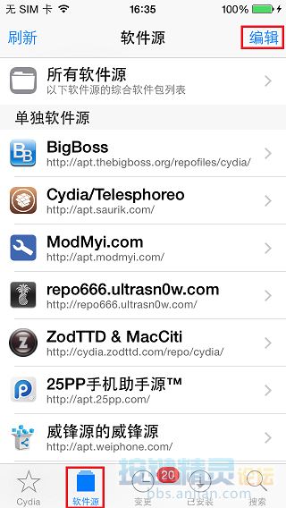 1、打开Cydia(越狱系统里都会自带的,如果没有或者闪退说明你没越狱或越狱出问题了,请重新越狱)