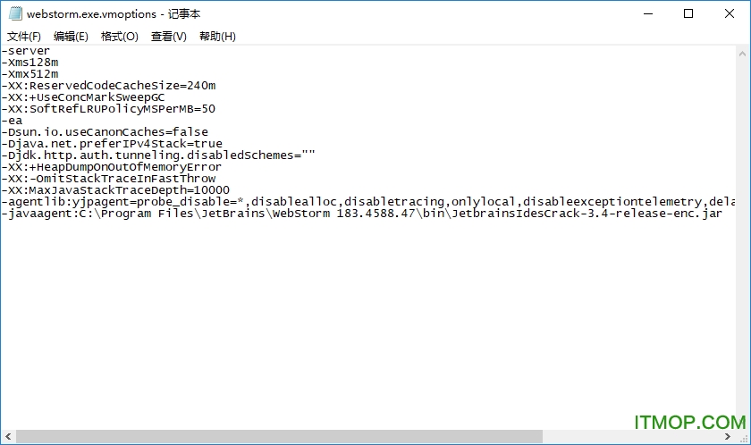 再文本后面添加破解文件的路径(路径是根据你安装的位置来的),比如小编测试的路径就是【-C:\Program Files\JetBrains\WebStorm 183.4588.47\bin\JetbrainsIdesCrack-3.4-release-enc.jar】