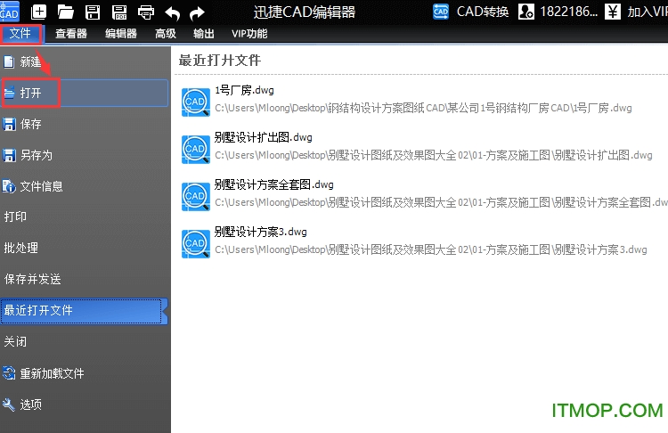 5、进入到编辑器的操作窗口后,点 击软件顶部左侧菜单栏中的“文件”按钮,在其文件的下拉栏中点 击“打开”按钮,将需要进行进行添加文字的CAD图纸进行打开即可;