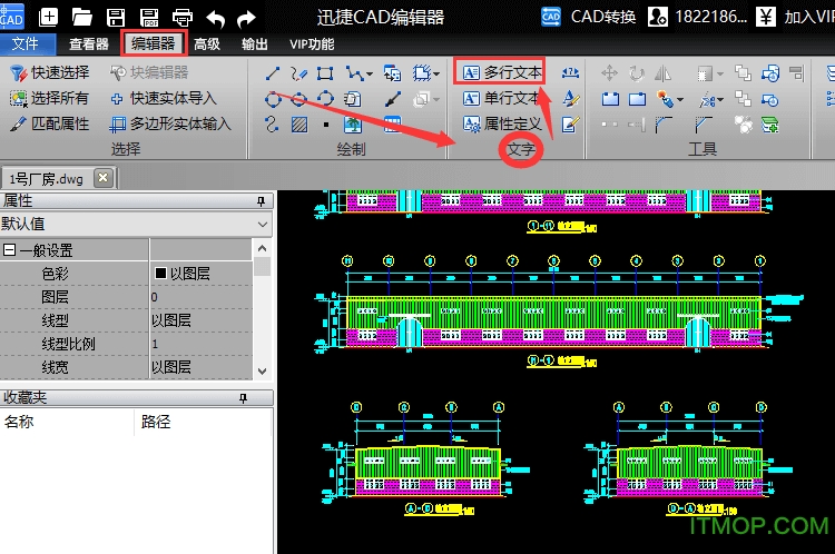 6、把编辑器顶部的菜单栏切换到“编辑器”选项卡,然后在点 击编辑器中的“文字”功能栏中的“多行文本”按钮,也可以点 击“单行文本”,接下来就在CAD图纸中需要添加文字的地方框选一下,之后就会弹出一个对话框;