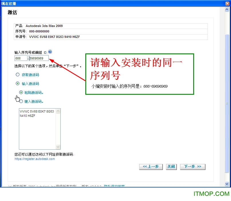 3、打开注册机,将申请号输入到注册机,生成激活码,然后将激活码复制到激活码输入框,按下一步,即可完激活。