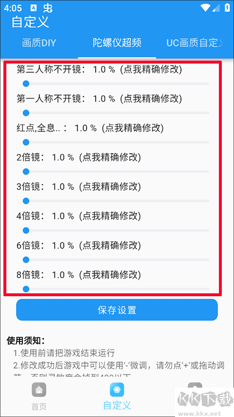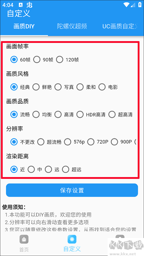 2、点击【自定义】开启自定义选项设置,包括画质DIY、陀螺仪超频、UC画质自定义;
