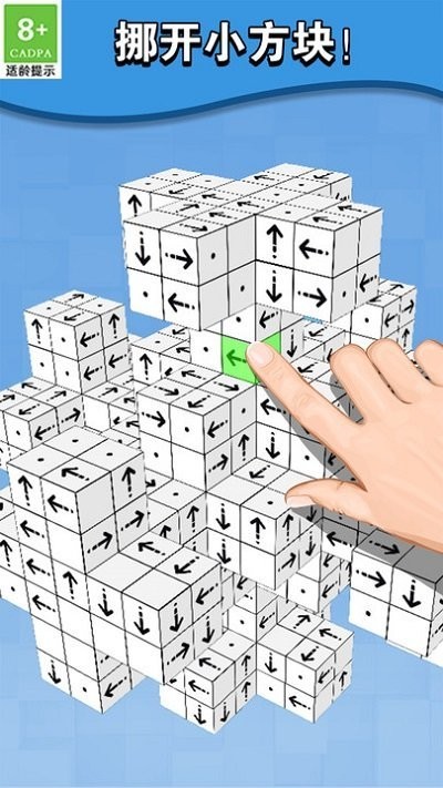2.玩家必须通过各种角度来观察不同箭头的方向,按照箭头的提示点击方块即可完成消除,获得指定的分数。