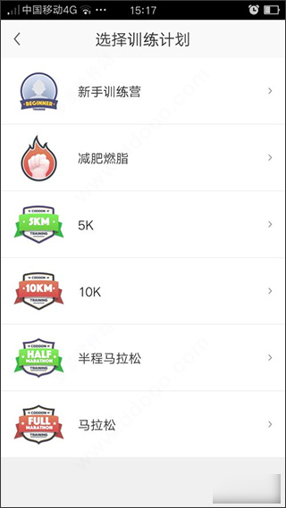 3、登录进咕咚的主界面后,我们会看到多种多样的选项,但是我们并不要着急地去点开它们,要一步一步地去设置才能更好的完成我们锻炼的定制,首先我们来到“运动”选项这里,划到第二页,进行训练计划的制定,一共有六种训练强度,分别是新手训练营、减肥燃脂等逐步递增,我们需选择适宜自身情况的情况进行参与,并设定参与的时间。