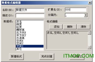 输入数据格式名称,文件扩展名,文件格式描述,数据分隔符等,可以选择的数据项有:点名、纬度、经度、椭球高、北方向X、东方向Y、水准高、空间X、空间Y、空间Z、其它。