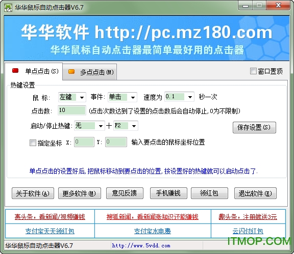 华华鼠标点击器是免费的鼠标工具,支持单点点击和多点点击,用户还能自定义脚本,让点击器更适合你的使用环境!有需要的直接来IT猫扑下载!