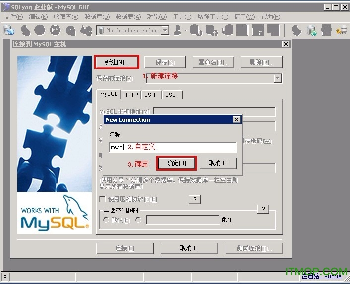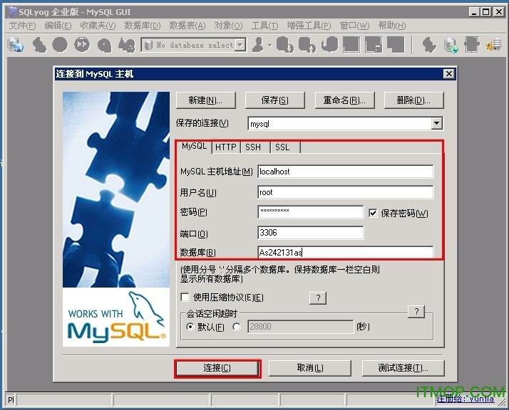 2、在连接到主机对话框中填入您的mysql数据库的相关信息,然后点连接。