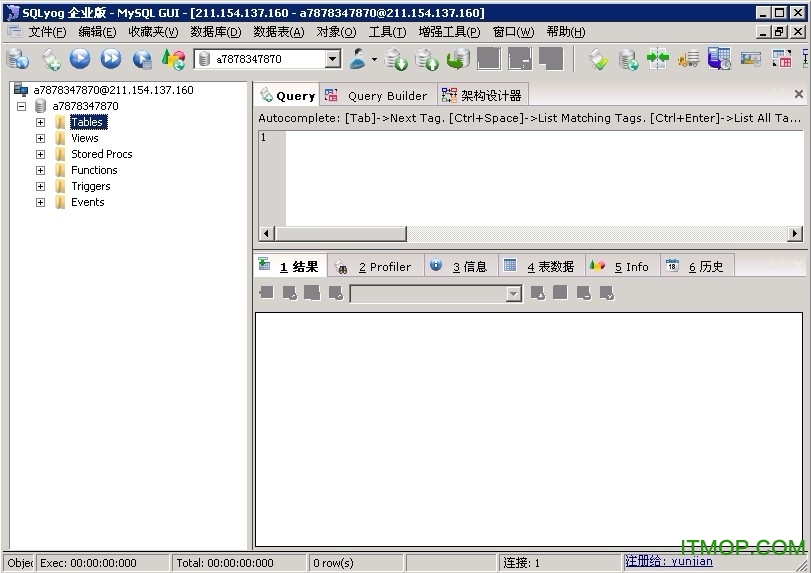 索引界面绝对是个好东东,这样你就可以CRUD查询索引和关键字了。这相对前端数据库如Microsoft access来说是个提高。如果考虑到MySOL刚刚开始提供对主(primary)和非相关(foreign)关键字关系的支持,本程序这部分的设计是很成熟的。在右下方的面板上,有四个标签页,即:结果(Result)、消息(Message)、对象(Object)和历史(History)。