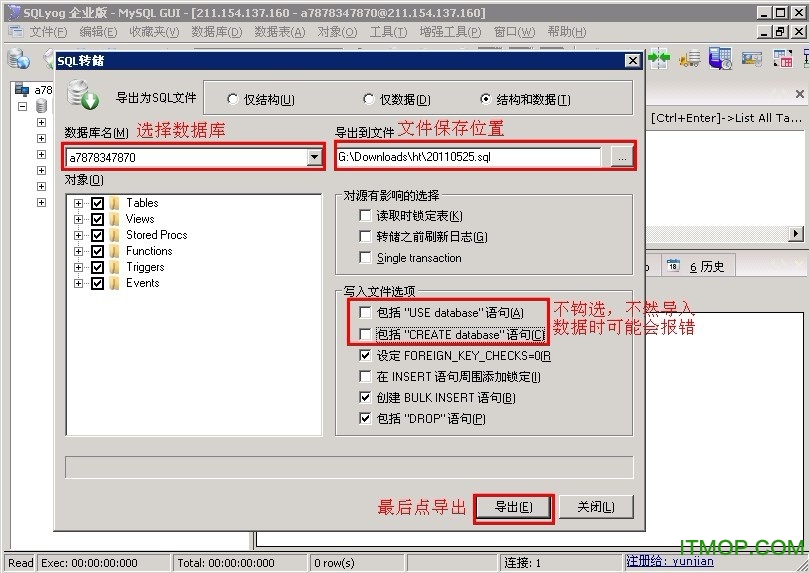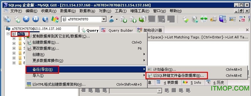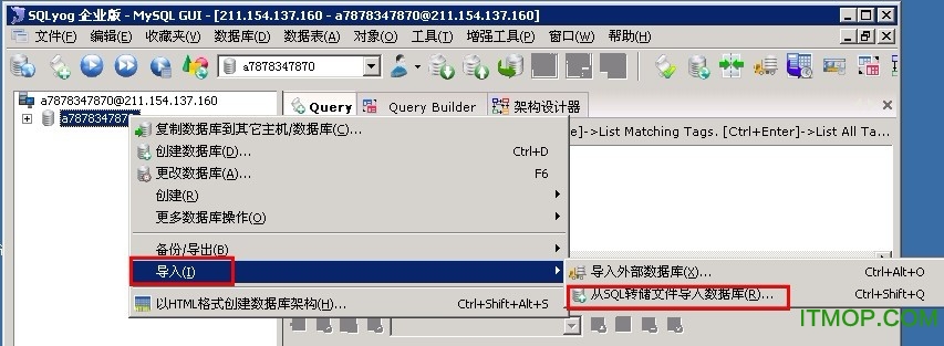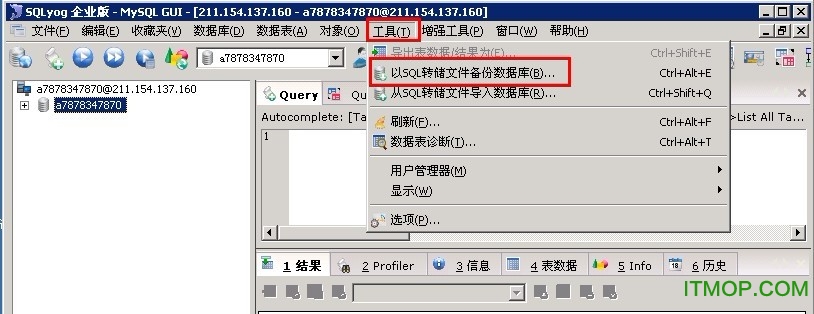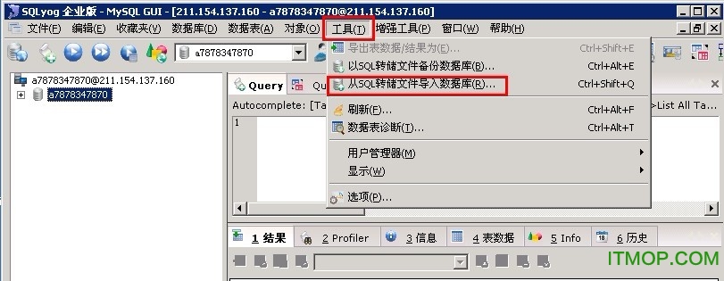 1、重复第一步,只是将数据库信息填写成要恢复的数据库服务器的信息,连接后,在菜单栏点击工具或选中数据右键操作,如下图。