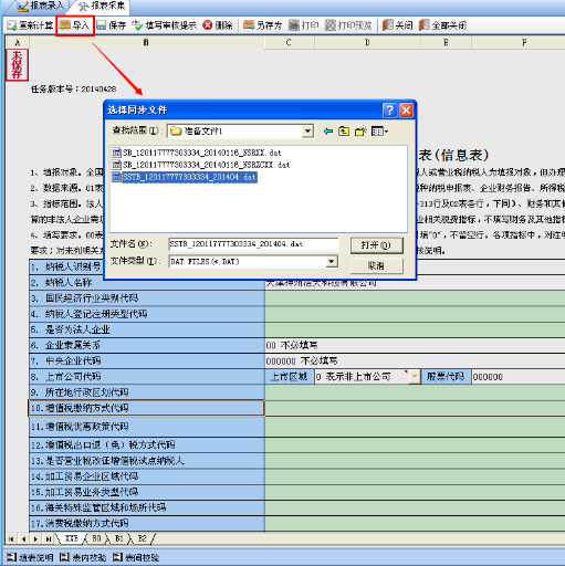导入:将税务局下载的同步文件导入,实现数据同步功能 (税收调查信息表、税收调查企业表)