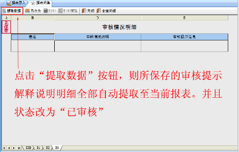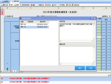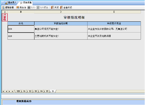 保存:录入完毕,点击“保存”按钮进行表内校验,若通过则状态改为“已审核”,不通过改为“已保存”,并且自动弹出未通过的校验提示