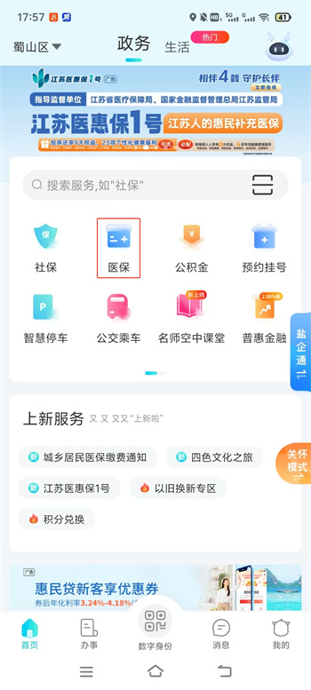 1、在来到软件之后就会看到中间的功能栏一列有一个【医保】,这里面掌管了你一切关于医保各方面的内容,点击这个前往医保缴费记录查询;