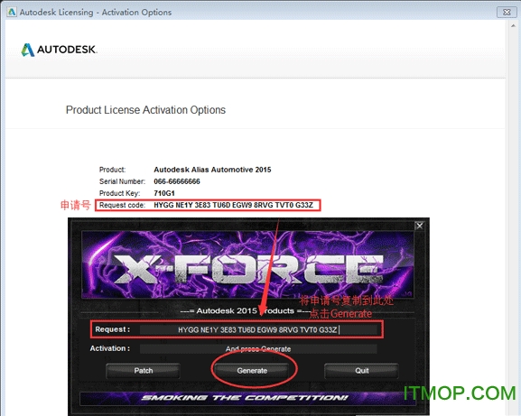 10、回到程序将Alias AutomoTive2015申请号复制到注册机的第一栏,然后点击“Generate”,生成激活码。