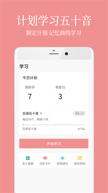 1.根据记忆曲线理论,制定了科学合理的五十音学习计划,自动安排复习时间,确保你能够多次复习五十音,加深记忆。