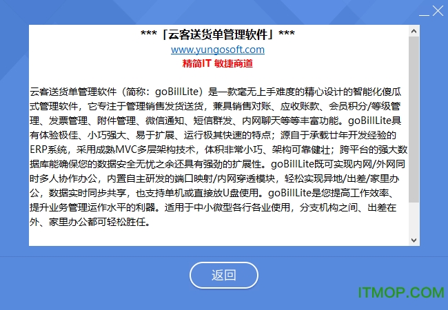 云客送货单管理软件(简称:goBillLite)是一款毫无上手难度的精心设计的智能化傻瓜式管理软件,它专注于管理销售发货送货,兼具销售对账、应收账款、会员积分/等级管理、发票管理、附件管理、微信通知、短信群发、内网聊天等等丰富功能。goBillLite具有体验极佳、小巧强大、易于扩展、运行极其快速的特点;源自于承载廿年开发经验的ERP系统,采用成熟MVC多层架构技术,体积非常小巧、架构可靠健壮;跨平台的强大数据库能确保您的数据安全无忧之余还具有强劲的扩展性。goBillLite既可实现内网/外网同时多人协作办公,内置自主研发的端口映射/内网穿透模块,轻松实现异地/出差/家里办公,数据实时同步共享,也支持单机或直接放U盘使用。goBillLite是您提高工作效率、提升业务管理运作水平的利器。适用于中小微型各行各业使用,分支机构之间、出差在外、家里办公都可轻松胜任。
