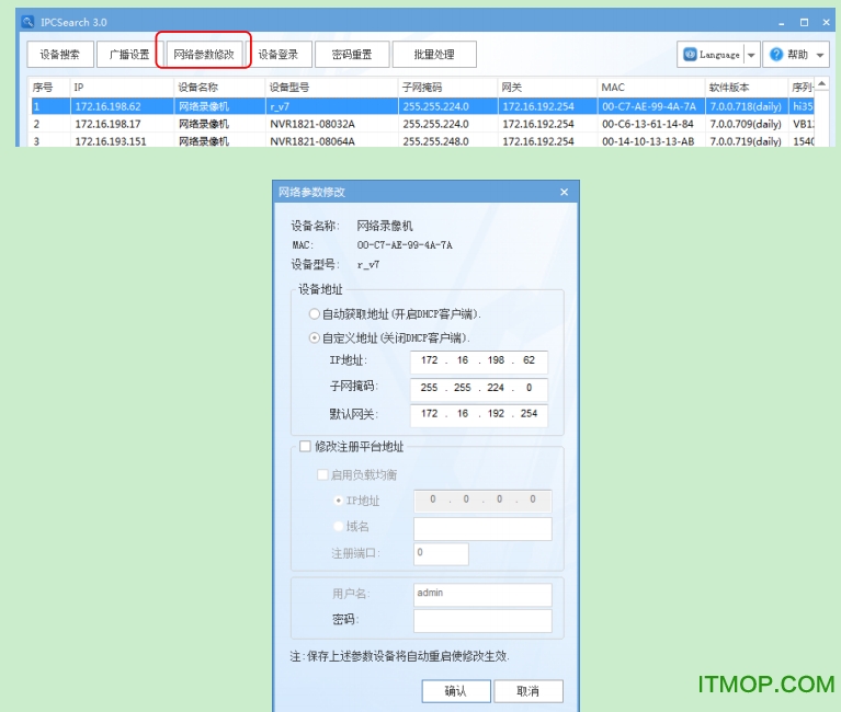修改网络参数是对设备的 IP 地址、子网掩码、默认网关以及注册平台地址进行修改。