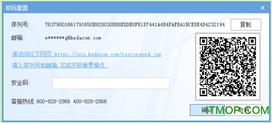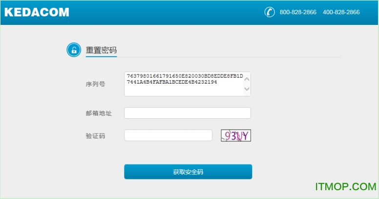 2) 单击页面链接戒扫描二维码进入密码重置页面,输入序列号、邮箱地址(激活设备时输入的邮箱地址)和验证码,获取安全