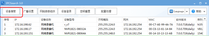 单击“设备搜索”按钮,系统可自劢发现广播域及单播域内的所有设备并自劢添加到设备列表中