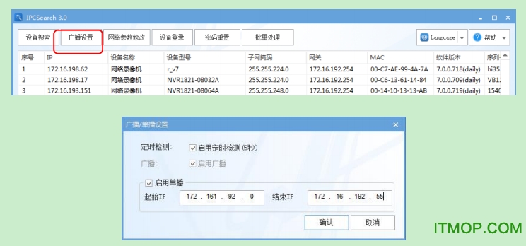 1) 系统默认使用广播搜索,当需要搜索广播域以外的设备时,勾选“启用单播搜索”可搜索到位亍该起止 IP地址内的设备。