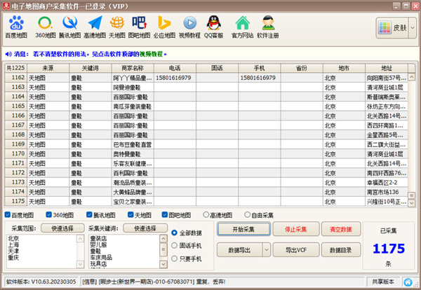 导出数据包括“商户名、联系、省份、地市、地区、详细地址”等等。软件特点:只要用鼠标点点击即可,无需写任何采集规则,【并可直接导出Excel文件,一键导入手机通讯录,适合电销和微信营销。】除了采集功能之外,软件还有自动过滤重复功能,防限制采集设置功能(可以避免大部分情况下不被限制),历史数据查询功能(只要采集过的信息,就能去“已搜索查询”中查询出来)。