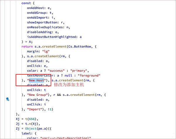 2.搜索需要汉化的单词,比如,主界面有一个 New Host, 在entry.js里搜索 “New Host”,然后修改为对应汉字,比如“新建主机”;