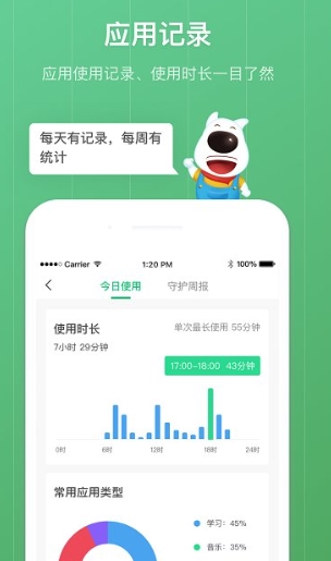 4、时间守护,合理的分配手机使用时间,小朋友们养成良好的习惯,每周将根据自己的情况生成使用周报,家长更了解孩子们的喜爱偏好。