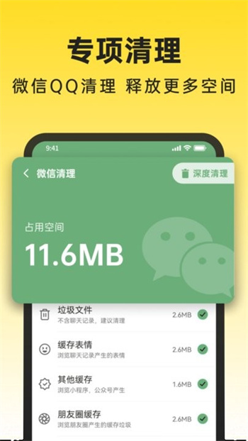 2,对用户手机深度研究,提供全面的清理手机解决方案,智能分类将视短视频,微信,一键清理垃圾所占用的垃圾,各方面全面的进行清理。