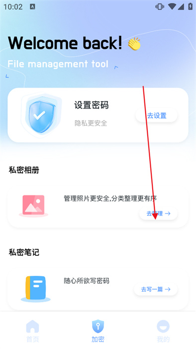 1、首先,将软件从桌面上点击进入,并顺利了解到各种工具,排版十分的清晰,切换到【加密】页面;