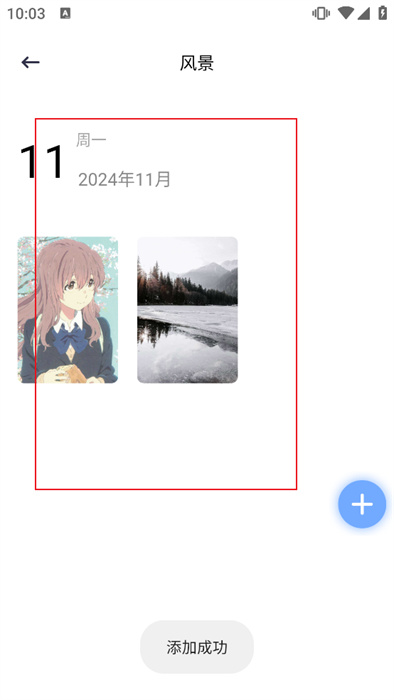 4、紧接着,点击右下角的蓝色加号,这样就能顺利添加照片,返回即可看到照片添加的时间。