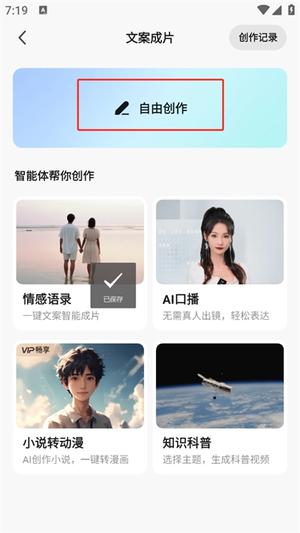 3、进入后将会看到多种创作方式,可以自己选择自由创作进行视频生成;