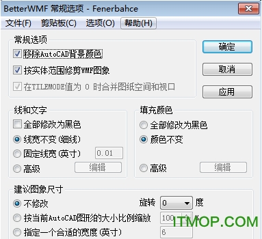 3、转到BetterWMF应用程序界面,选中常规选项中的”移除autocad背景颜色“和”按实体范围修剪WMF图像“;在线和文字中,选择全部修改为黑色,我一般使用固定线宽0.025英寸或默认。然后选择剪贴板菜单中的”立即修改和替换“,单击”应用
