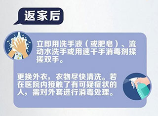 更换外衣,衣物尽快清洗。若在医院内接触了有可疑症状的人,需对外套进行消毒处理。