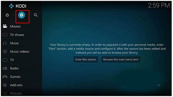 1、打开kodi播放器手机版,进入主界面后选择左上方中间的齿轮。