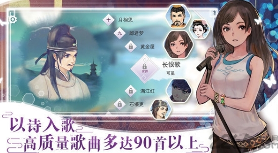 以诗入歌游戏中有着上百首的歌曲,可以供玩家选择挑战。