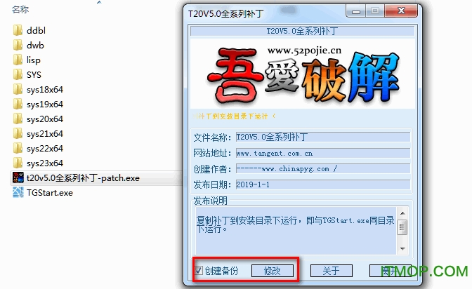 6、打开软件包中的t20天正结构v5.0破解补丁,创建备份勾上,再点击修改即可破解;