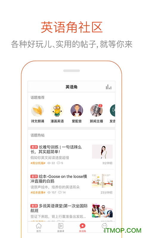 找到你感兴趣的话题,听大家的真实口语,当然你也可以开口参与哦,让你找到说英语的自信,一不小心交到一个可爱的学习小伙伴。