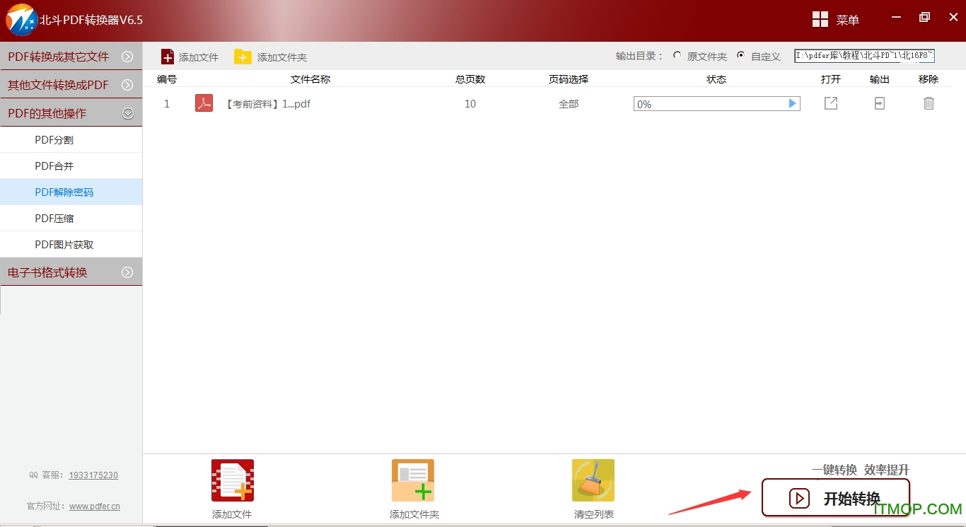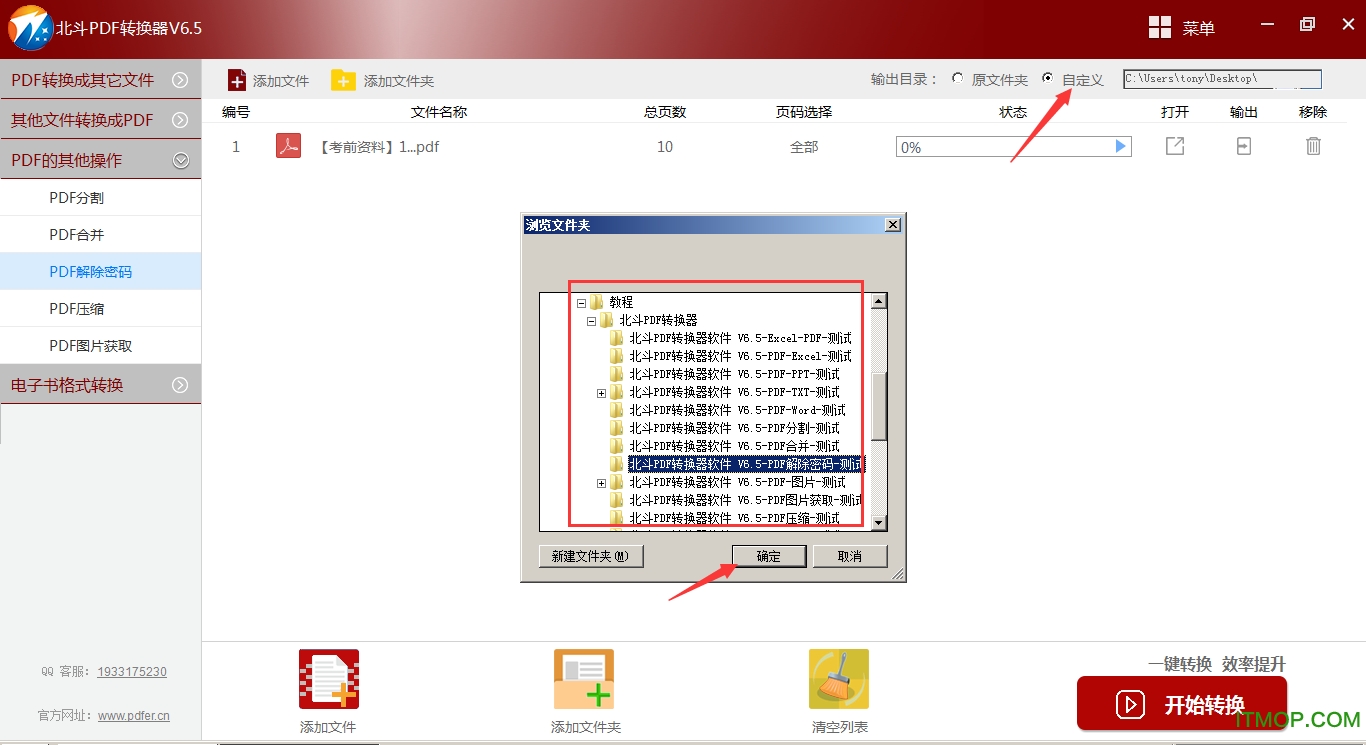 3.在北斗PDF转换器中,点击【输出目录】的【自定义】,选择解除密码的PDF文件存放位置,点击【确认】即可。