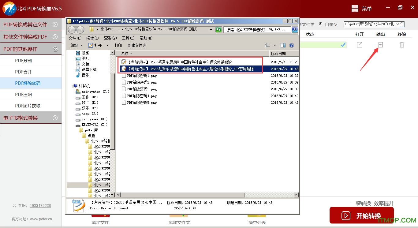 4.点击【开始转换】,即可进入快速进行PDF密码破译5.在PDF转换器的PDF合并完成后,点击【输出】即可查看到被解除密码的PDF的文件保存的位置。,实时进度可以查看,可以随时暂停。