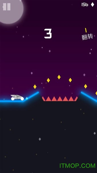 当摩托车倒转,仰面停滞时即为翻车,游戏失败。根据赛道轨迹控制小车跳跃翻转,以获取更多金币。