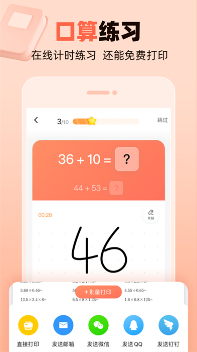 3、覆盖学前至四年级人教版练习题目,模拟线下口算练习,更贴近孩子口算练习场景。