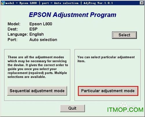 3、这时候进入到另一个对话框,我们点击particular adjustment mode按钮,进入打印机维护;