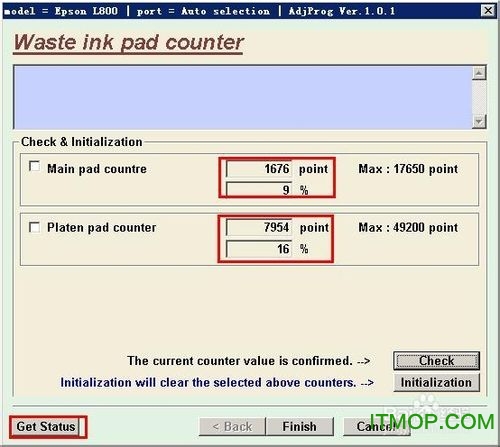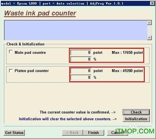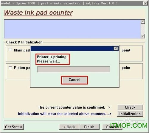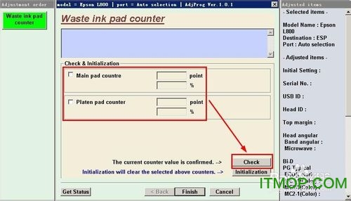 11、这时候我们把打印机开机,然后点击check按钮,已查看废墨量,这要等待几分钟时间,因为打印机开机后,维护软件需要认到打印机并读取芯片;