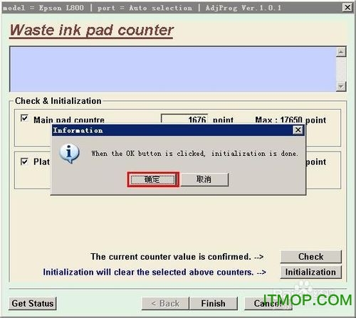 7、我们等软件读取出了打印机废墨比例之后,就可以点击chick下面那个按钮进入废墨清零过程;这时候软件会弹出如下对话框我们点击确定;