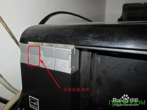9、我们点击打印机左侧三个按键中最左边那个关机键,也就是待机模式亮绿灯的那个键,来关闭打印机;