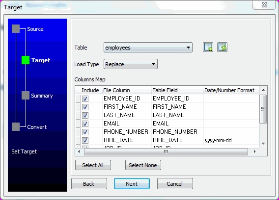 您需要选择接收数据库,并在目标模式中控制数据同化模式:追加,更新或替换。