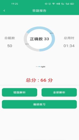 3, 答题报告采用环状类比图,正确数总题数使用总时长,对错题进行解析或者查看全部习题的解析做法,是自己更进步也可点击继续练习。
