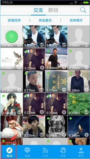 2、登陆成功后即进入到主界面,也就是身边页面,可以查看给你推荐的离你最近的朋友信息,同时你可以根据距离排序、筛选器关、宫格模式进行设置。